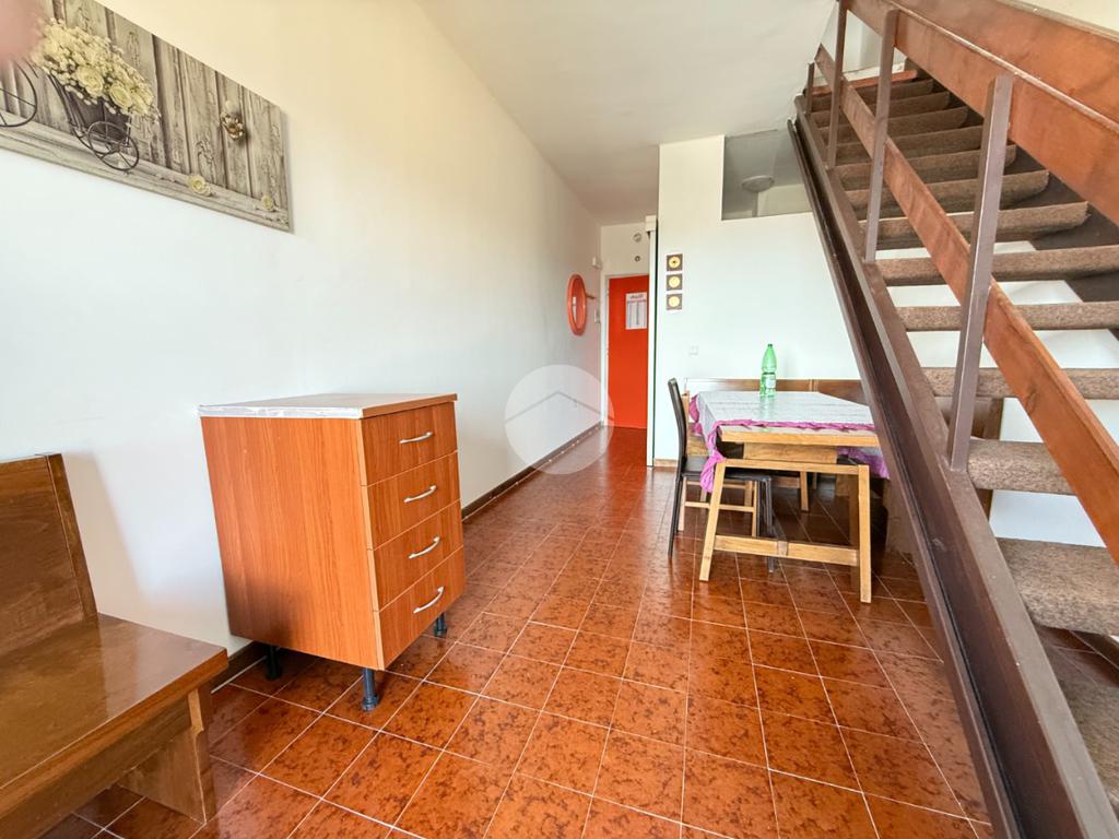 La soluzione è così disposta: entrando ci accoglie un corridoio che conduce ad una zona giorno con affaccio su balcone panoramico e un cucinotto separato. Salendo troviamo un ampio vano (dov'è possibile realizzare una terza camera da letto) che sfocia a due camere matrimoniali e un bagno con vasca.