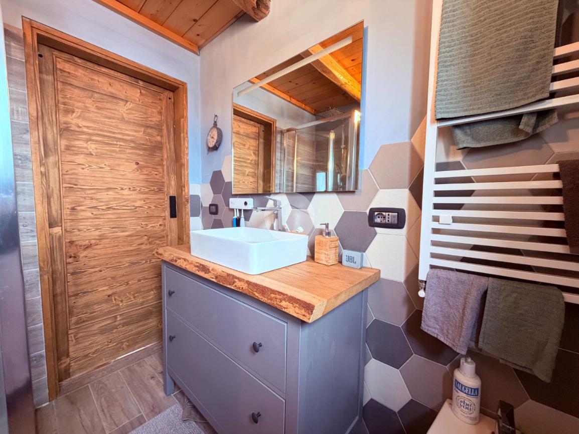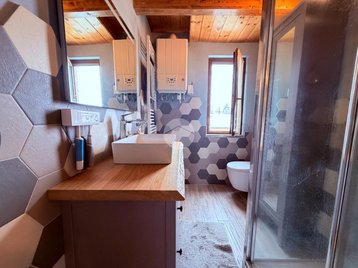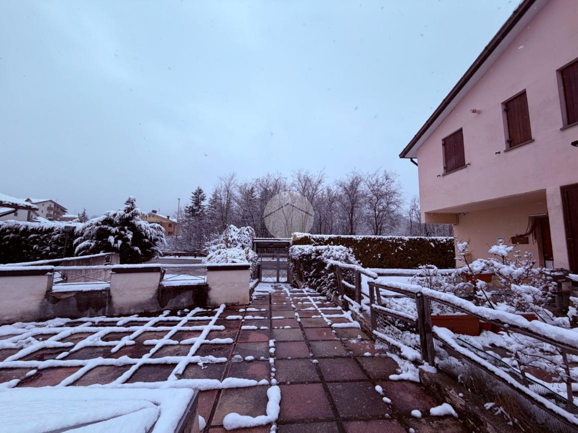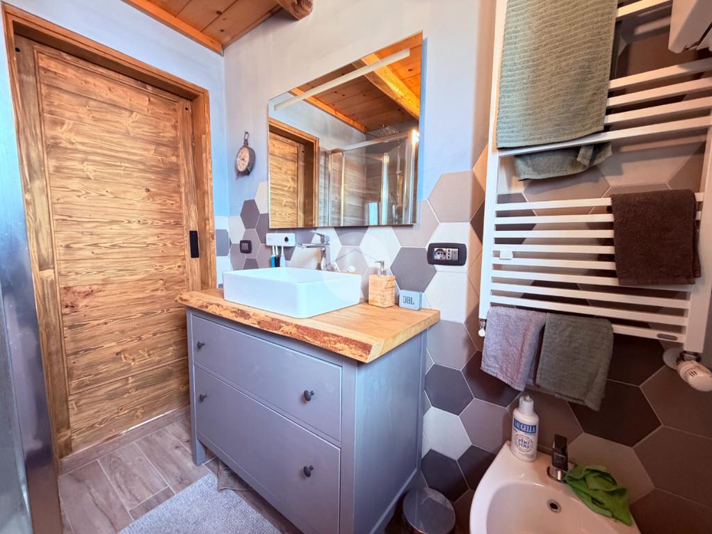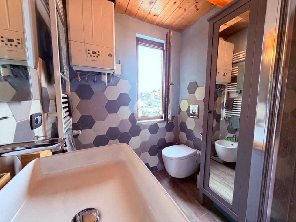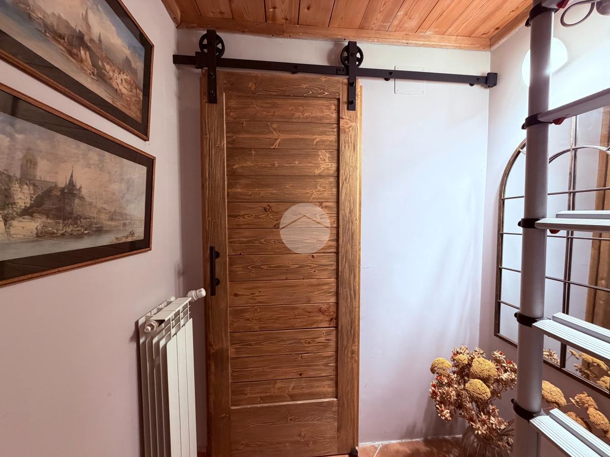 Villetta a schiera su due livelli nel cuore di Rocca di Mezzo, a pochi passi dalle principali attrazioni e dai servizi del paese, ideale come casa vacanze o investimento. L’abitazione si apre al piano terra con una luminosa veranda dotata di vetrate scorrevoli, attualmente adibita a pratica zona lavanderia. Da qui si accede a un’accogliente zona giorno open space con angolo cottura completo di elettrodomestici (frigorifero, forno e lavastoviglie) e caratteristico camino angolare. Presente anche un comodo divano letto matrimoniale. Al piano superiore si sviluppa la zona notte, composta da una camera matrimoniale e un bagno finestrato con doccia. Di particolare pregio la porta artigianale in legno con carrucola decorativa, elemento unico che dona personalità all’ambiente. Completa la proprietà un funzionale sottotetto, accessibile tramite scala telescopica. L’immobile è rifinito con materiali di qualità, tra cui porte in legno di abete e armadiature a muro su misura, ed è dotato di porta d’ingresso blindata e cassaforte. Dal punto di vista impiantistico dispone di impianto elettrico nuovo e certificato, caldaia a condensazione, impianto satellitare e allaccio alla fibra. All’esterno, un giardino privato di circa 16 mq . Completano la proprietà un posto auto assegnato all’interno del garage condominiale e una cantina.